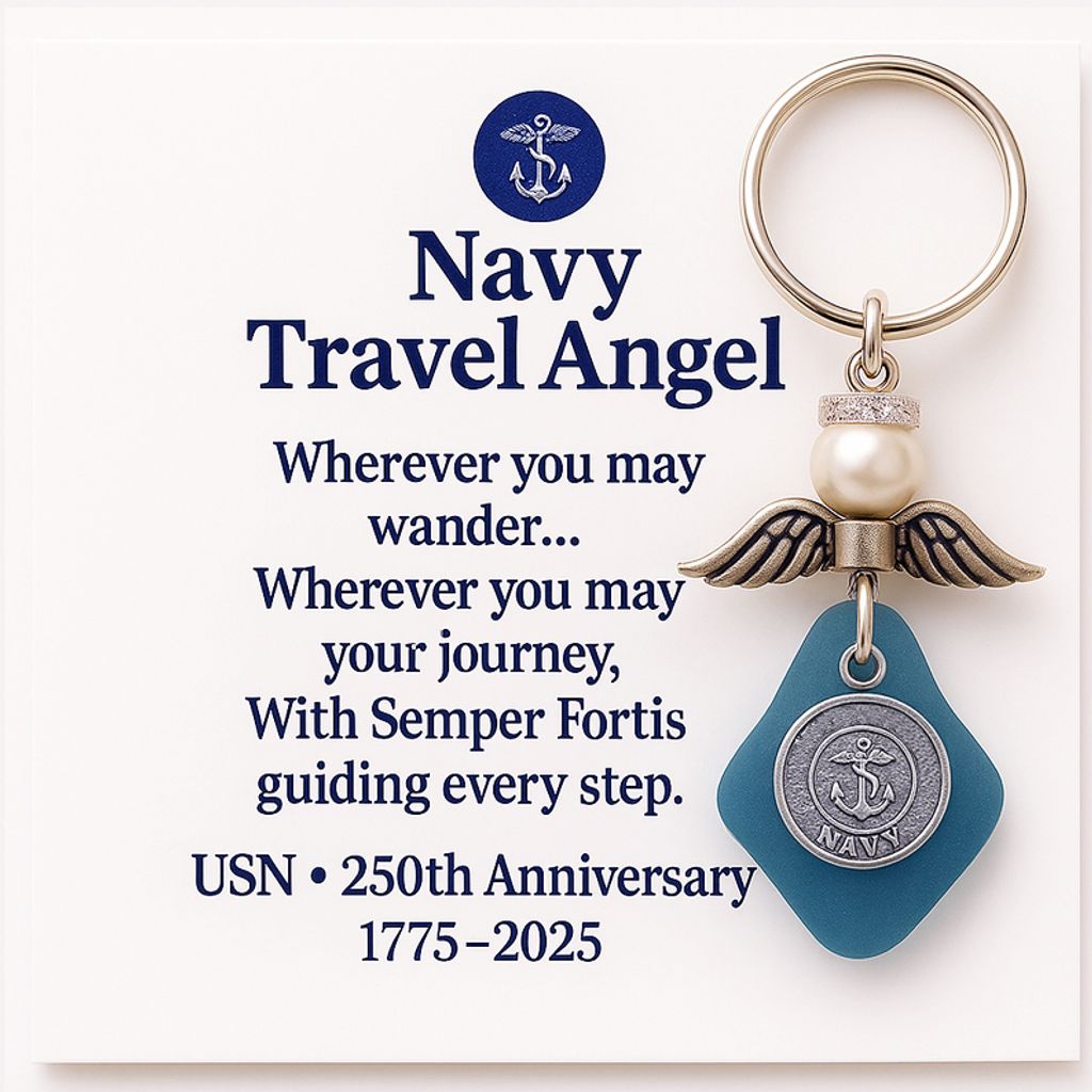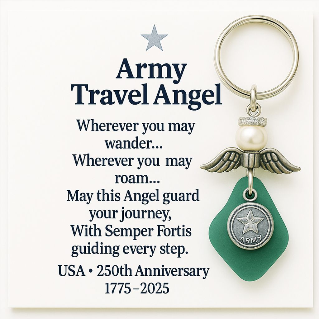 This Military Travel Angel is handcrafted by a U.S. veteran, using genuine sea glass and symbolic military emblems to represent the Army, Navy, and Marine Corps — each a tribute to 250 years of service and sacrifice.